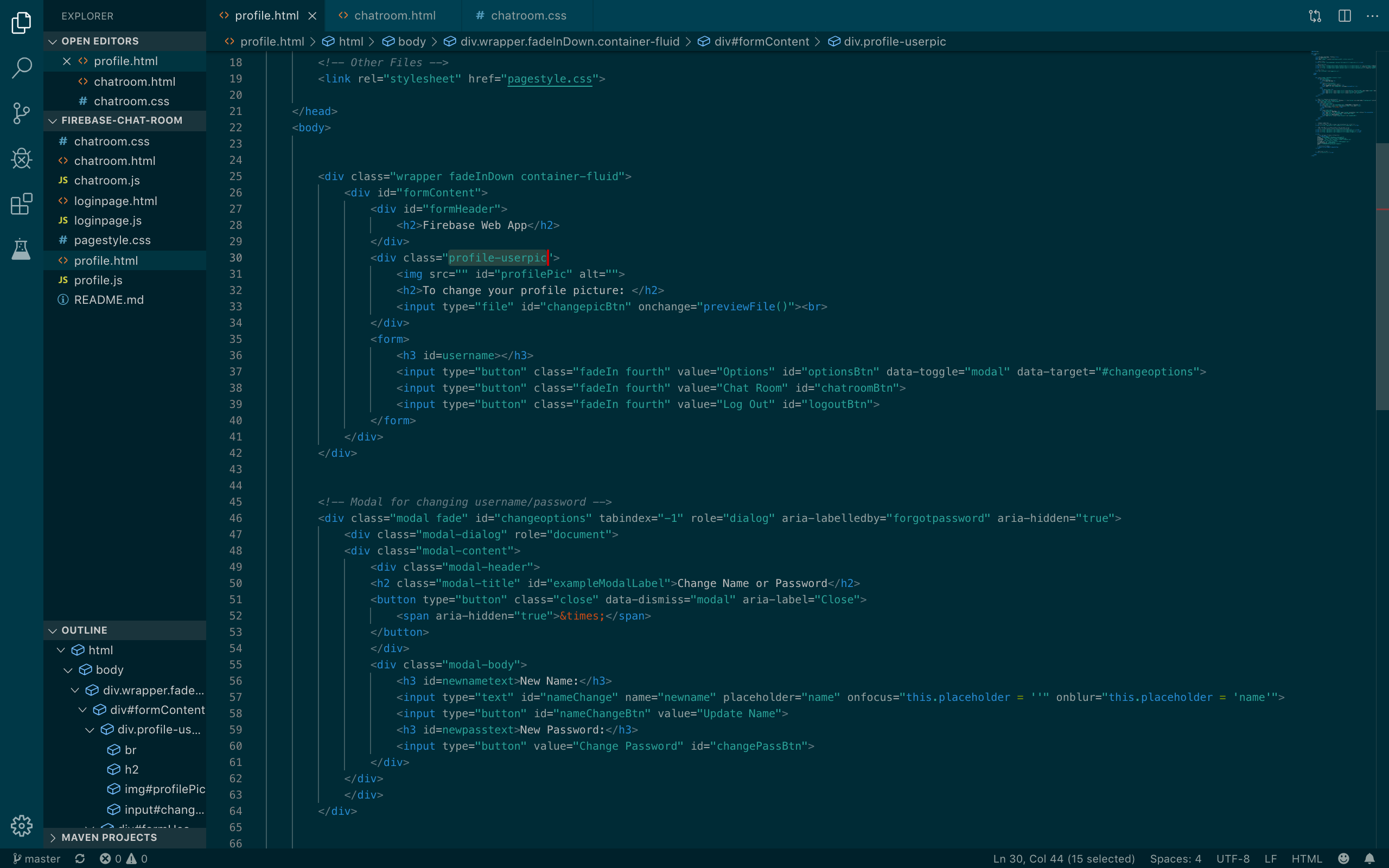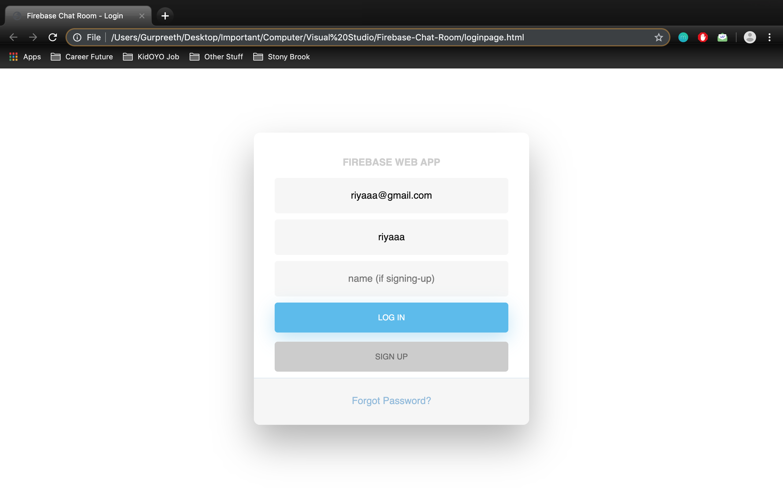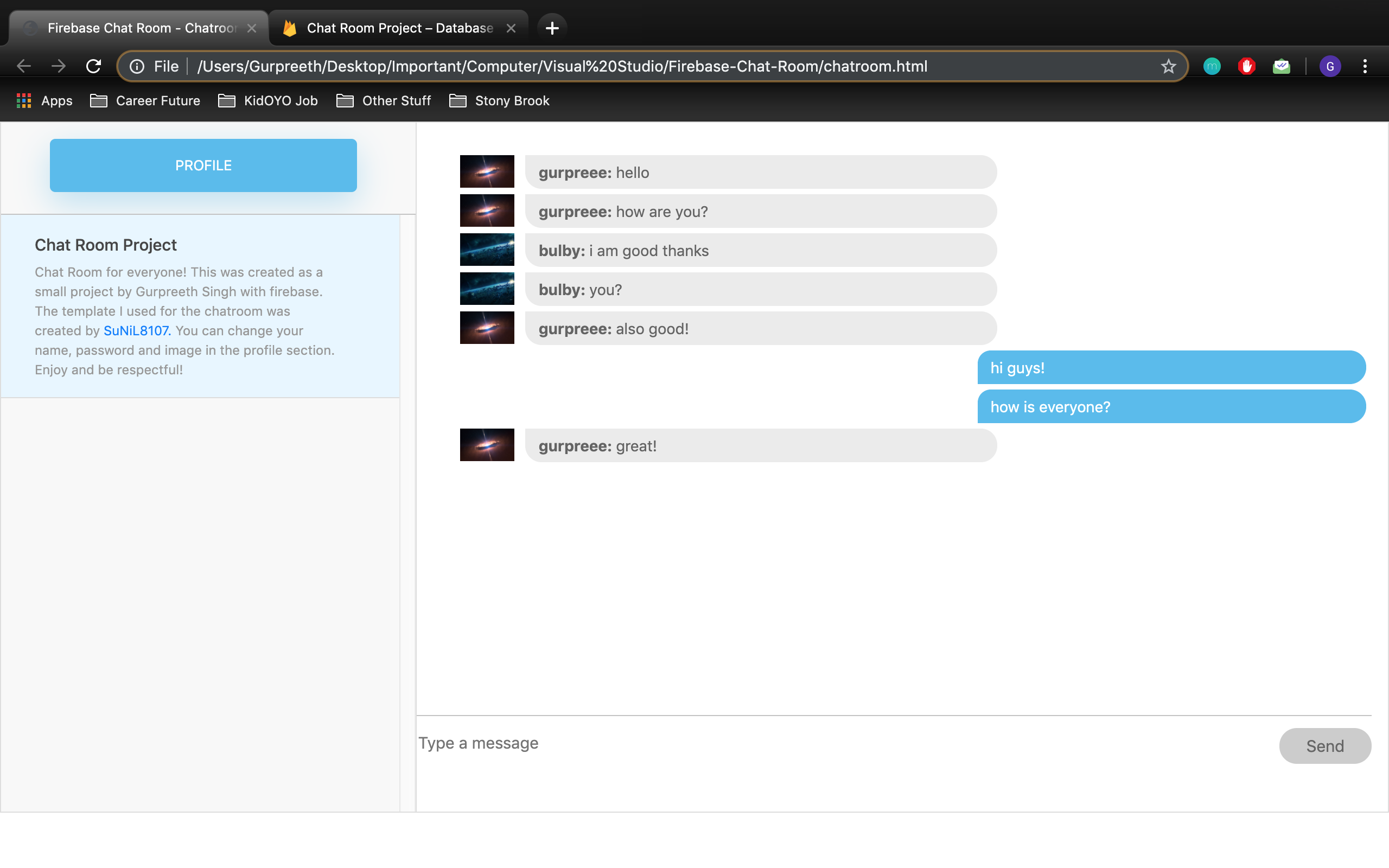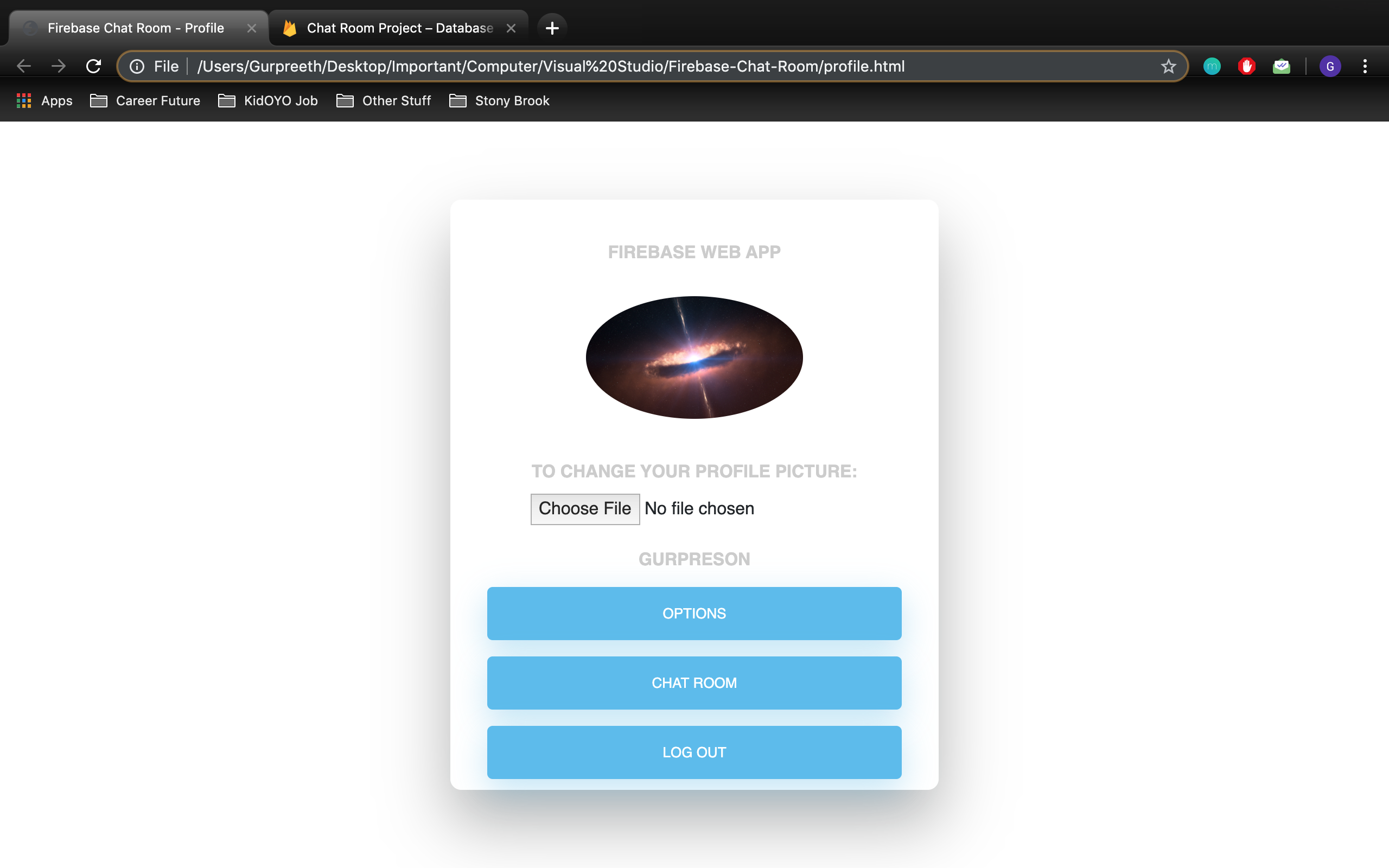 An online web chat room with a user login/signup using Firebase. Firebase Realtime Database was used to store the chat messages and Firebase Storage was used to store user profile pictures. Users can create an account, update their username and password, add and change their profile pic, send messages in the chat room, and view other people's messages.