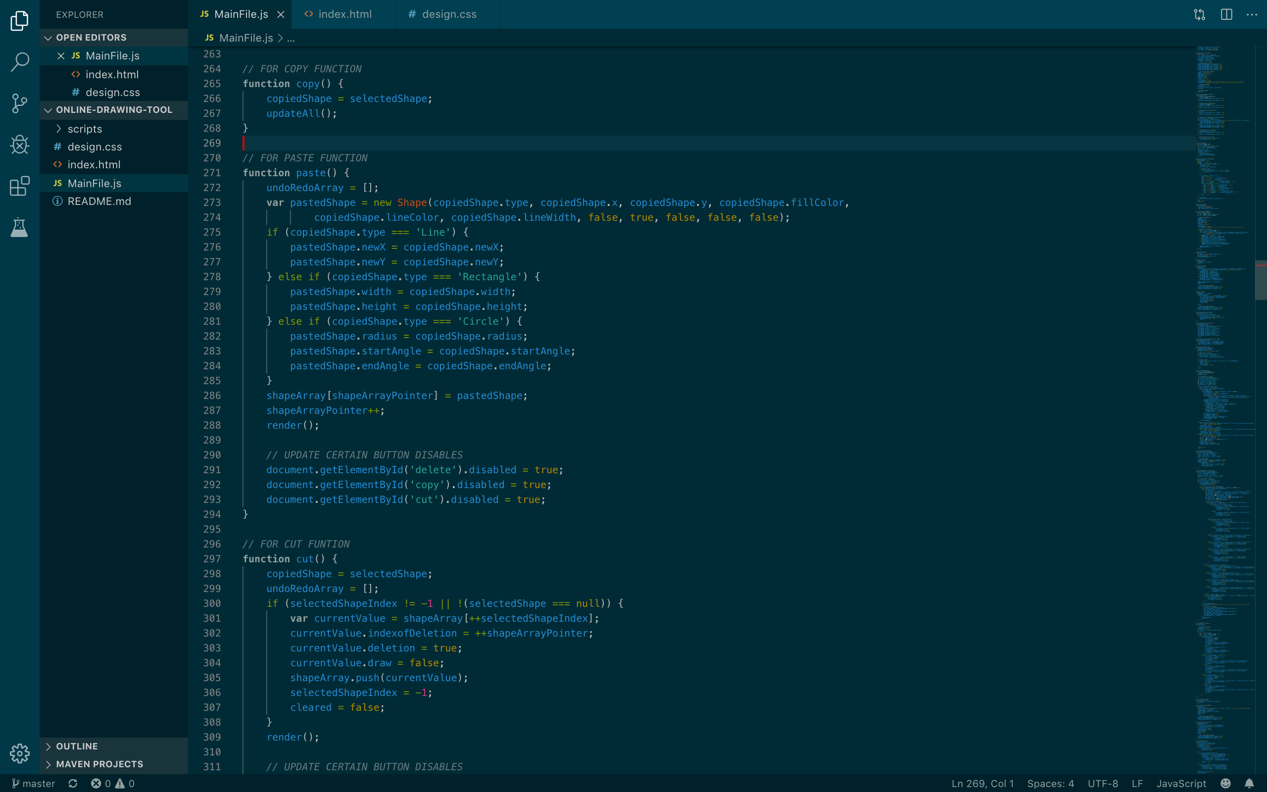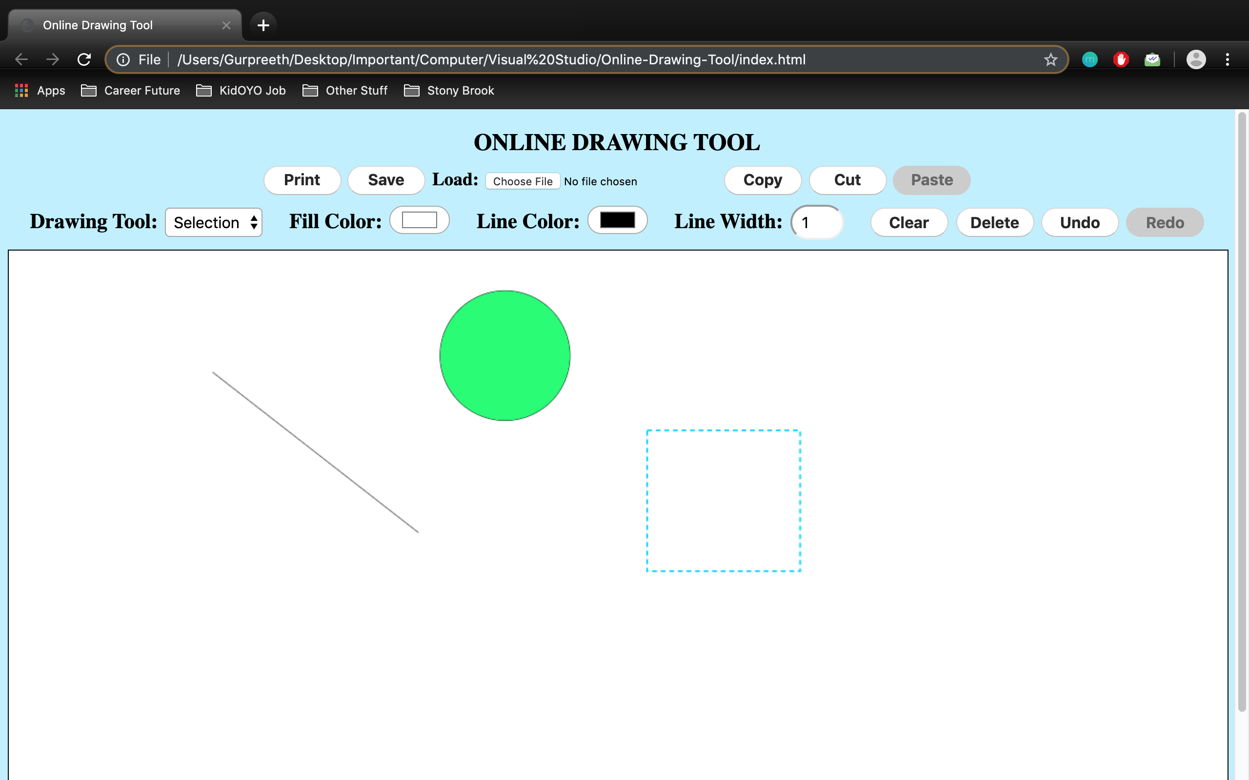 An online program where the user can create drawings and designs, like a mini paint. This was created using Javascript, HTML and CSS. Users can choose multiple shapes with different colors to draw, select already drawn items on the canvas and make modifications, and save/load their drawings. Some other functions include undo, redo, print, copy, paste and cut.