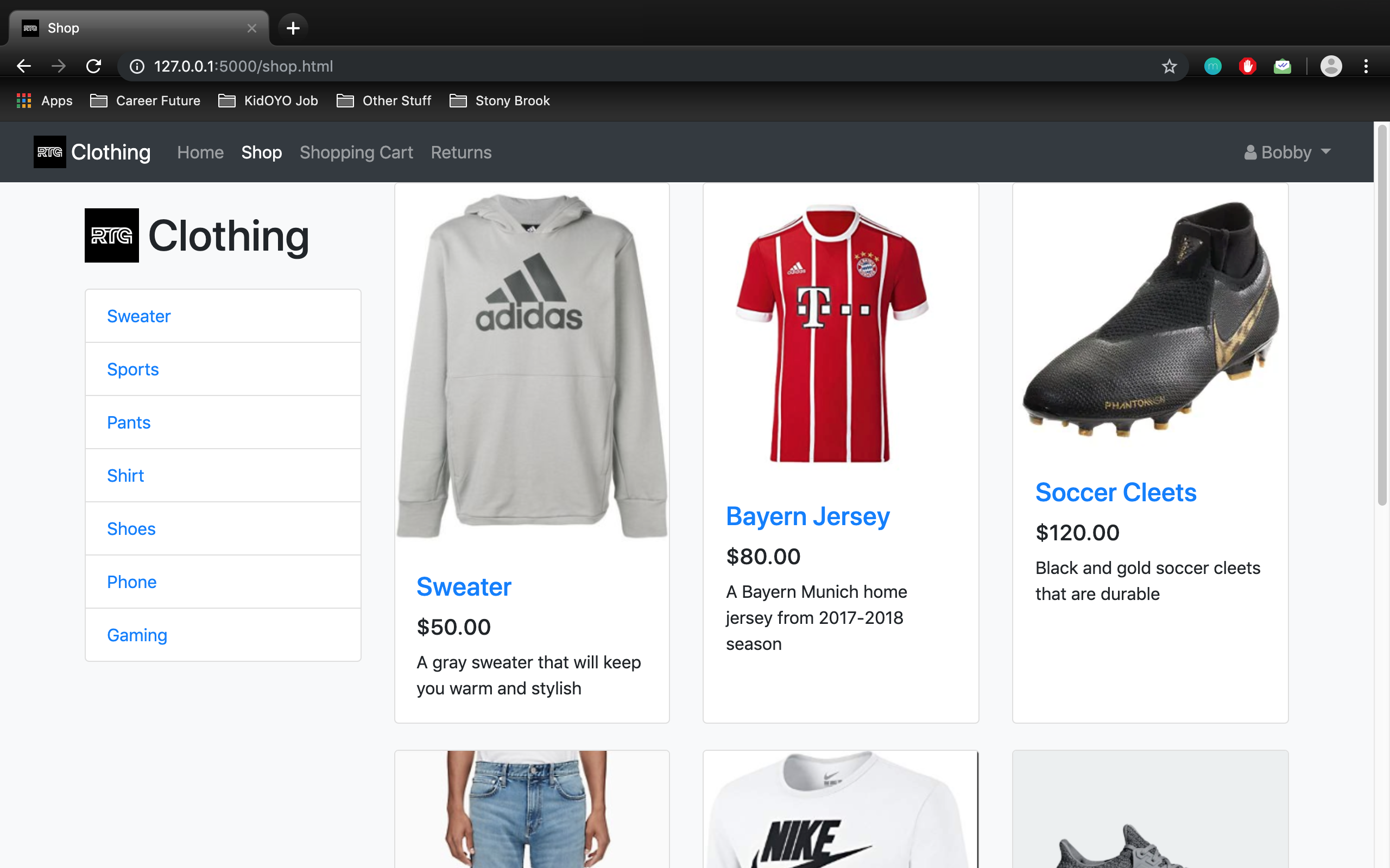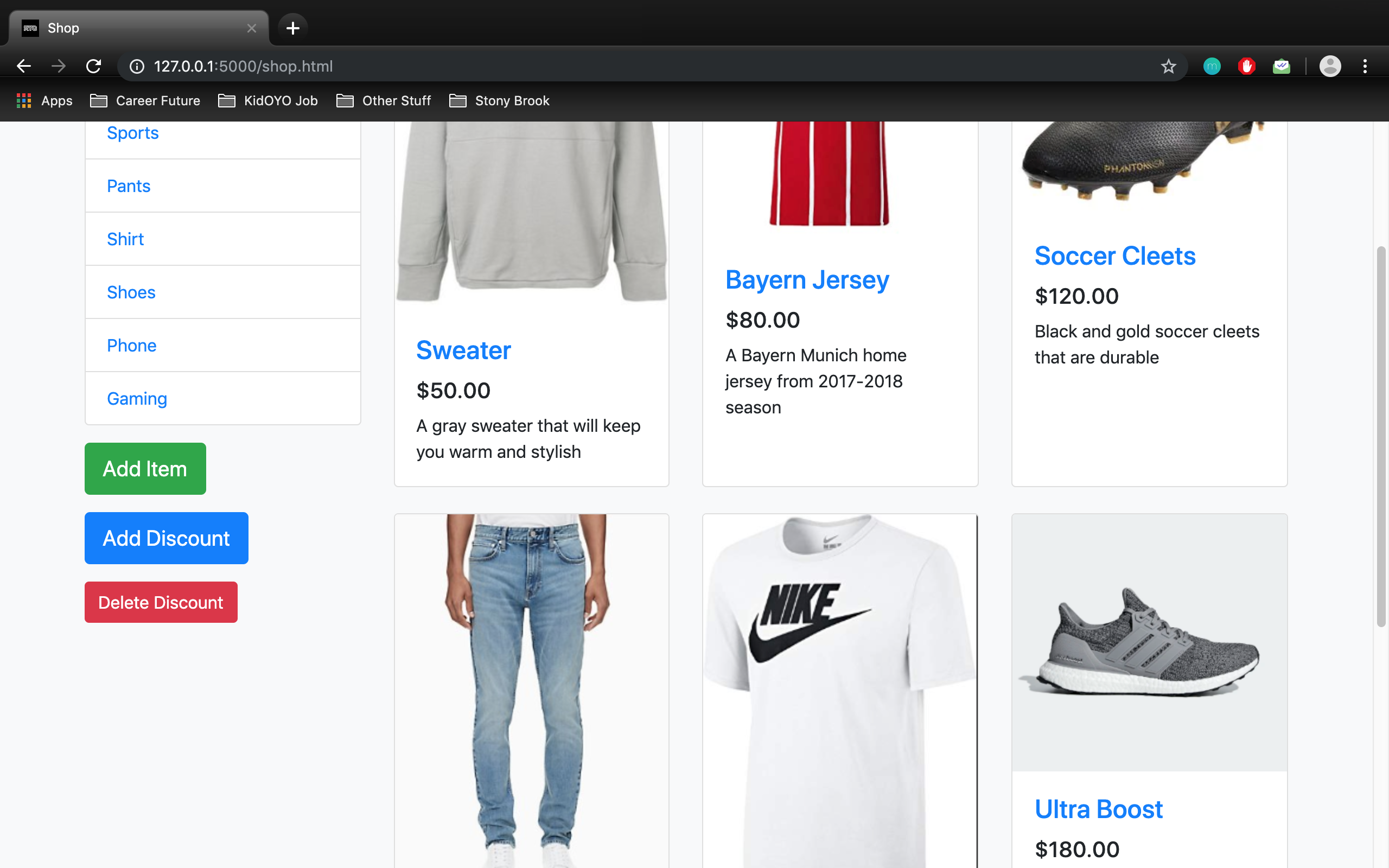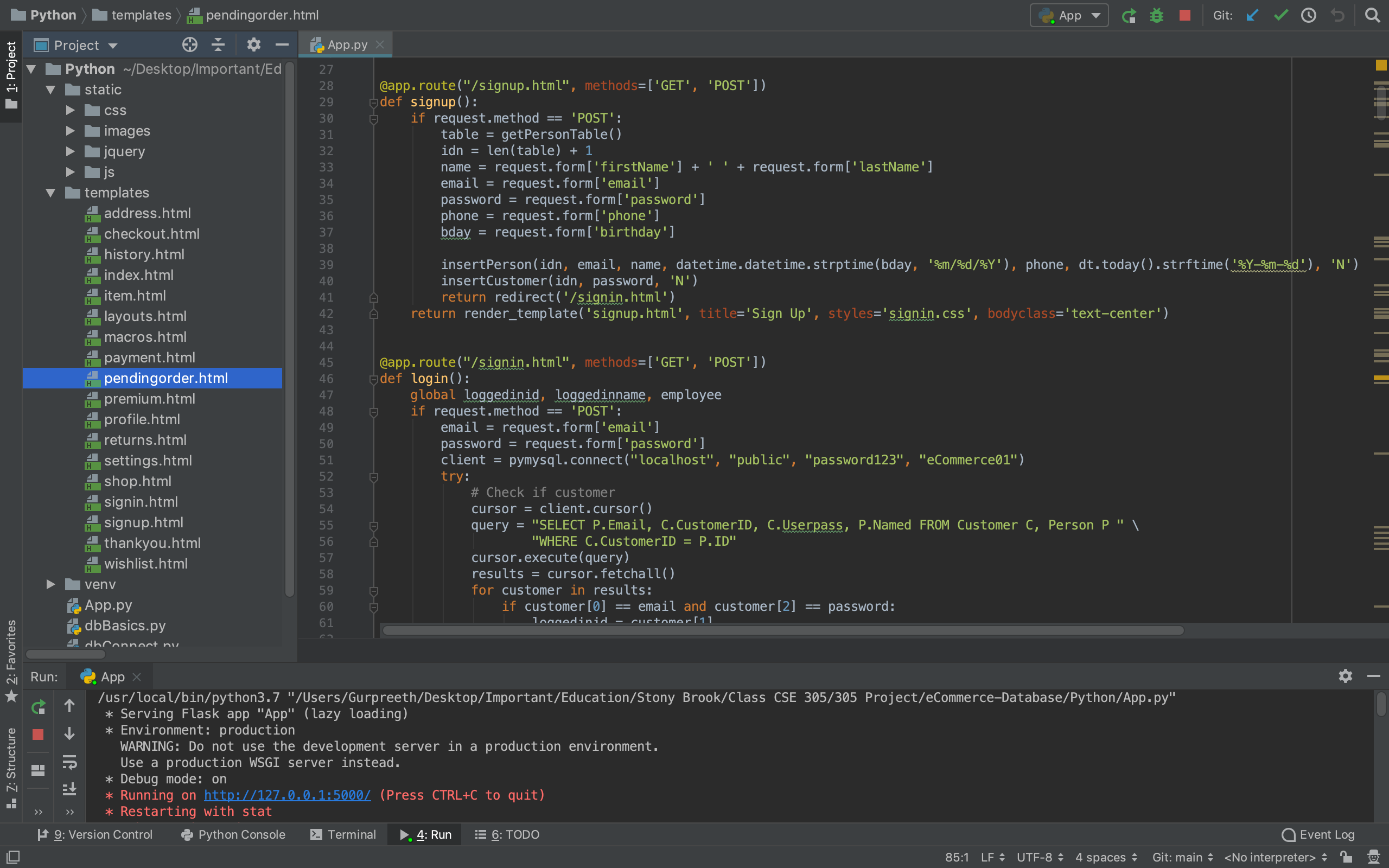 A website and database for eCommerce where Python, Flask, and SQL were used. MySQL Workbench was used for the database, PyCharm was used for Python and Flask, and Boostrap was used to design all the web pages. All transactions on the eCommerce site update the appropriate tables in the database. Both GETs and POSTs were used for managing data between the frontend and backend. Some general features include signup and login, different views and options for employees and customers, and categories for items.